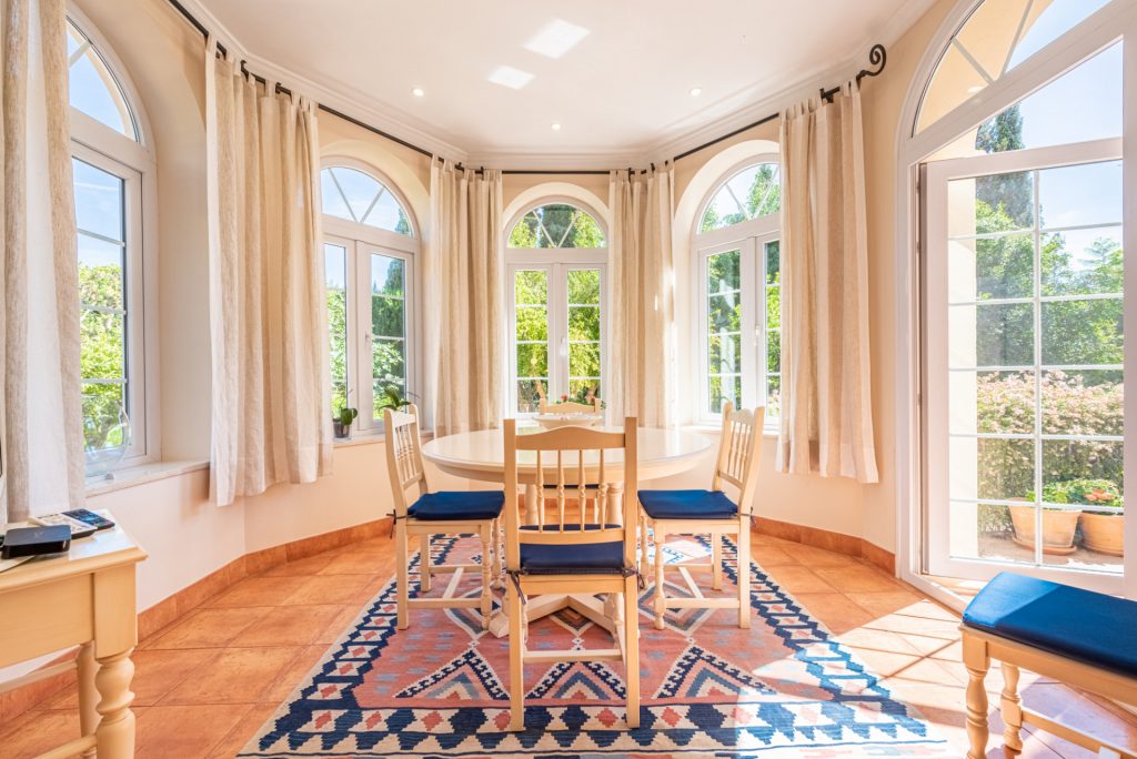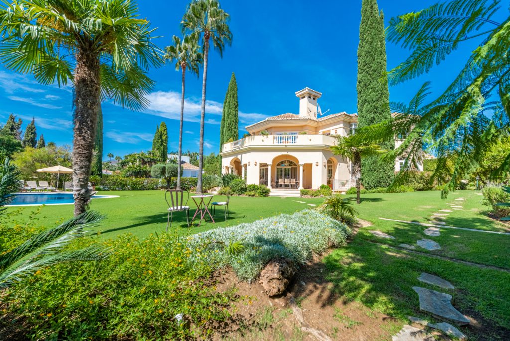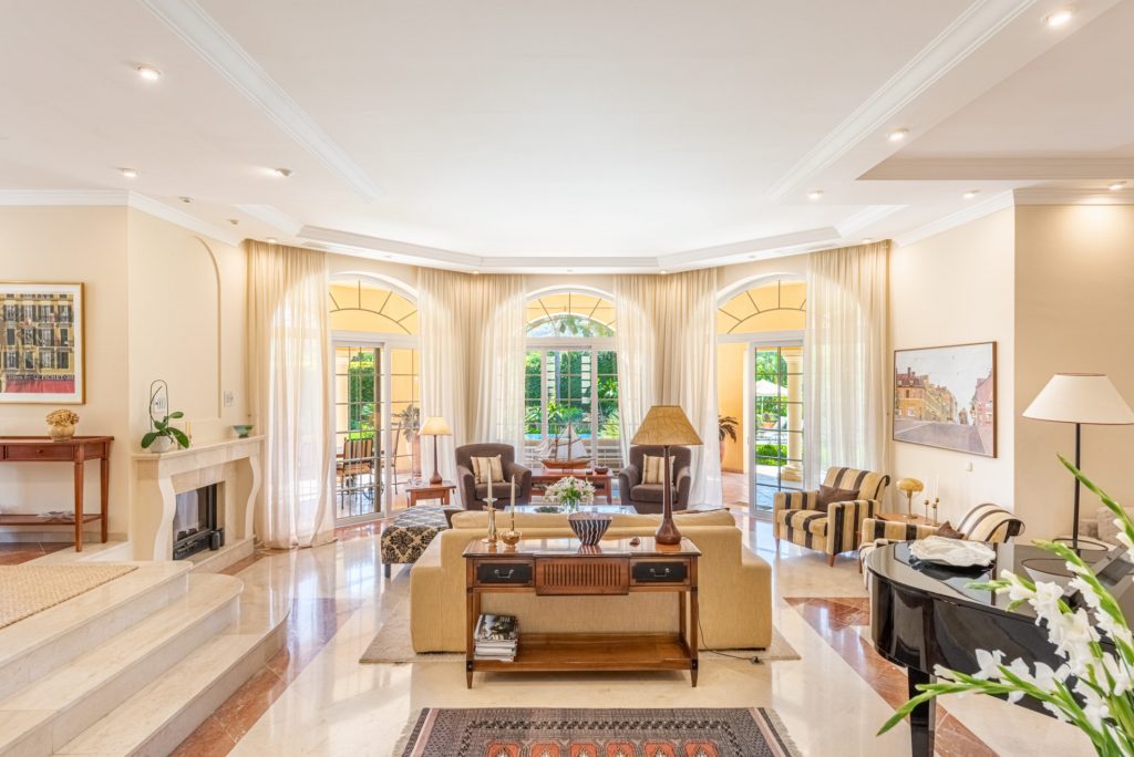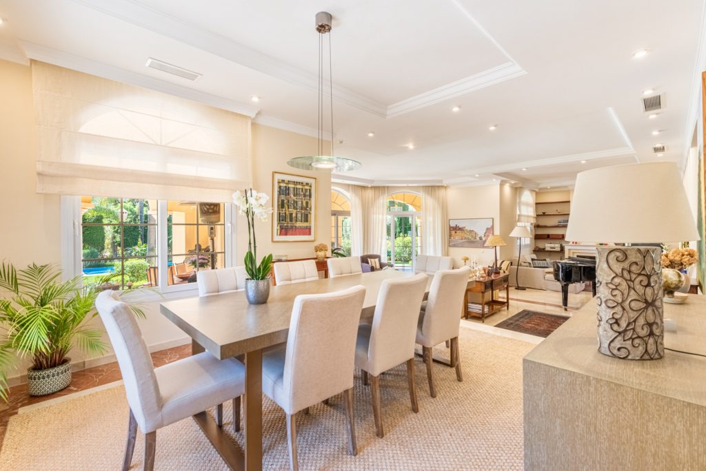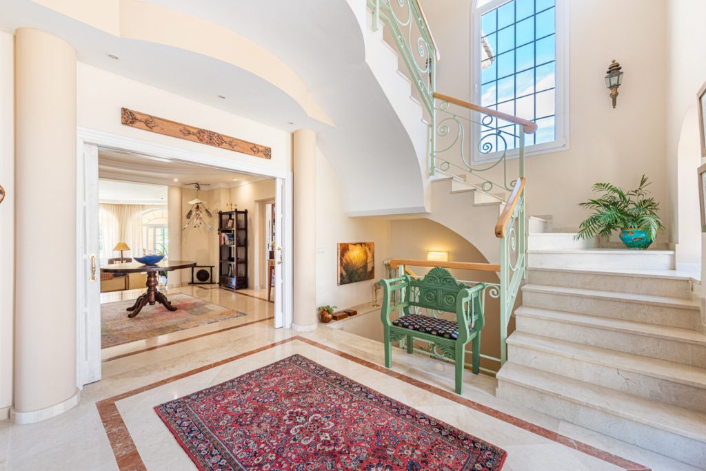 Mansión tradicional y atemporal con toques modernos de estilo escandinavo. 5 dormitorios 4 salas de baños Esta encantadora Villa es ideal como residencia habitual o para disfrutar de unas vacaciones inolvidables en cualquier época del año. Nada más a entrar que nos encuéntranos en el amplio recibidor con vistas directas al salón comedor y al impresionante jardín.