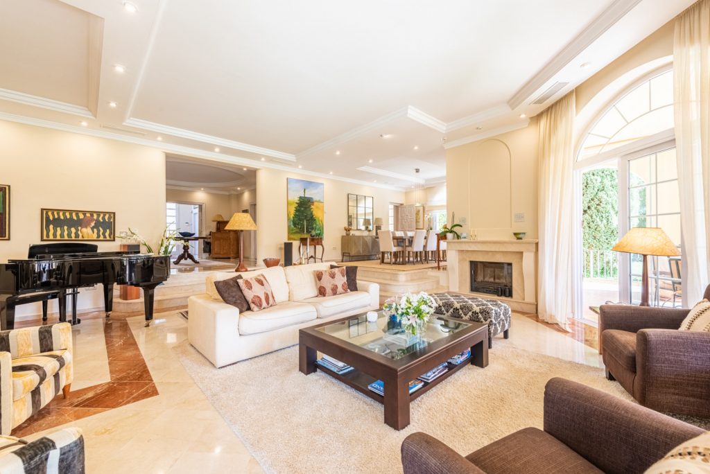 El gran vestíbulo de entrada conduce a la gran sala de estar y comedor en dos niveles bajando al amplio salón, encontramos 2 chimeneas así como un hermoso comedor y un precioso piano de cola. A través de las ventanas francesas, se accede a una gran terraza cubierta donde se puede disfrutar de cenas o bebidas con la familia y los amigos, desde ahí puede admirar las vistas al impresionante jardín y se puede pasear por el asi que de disfrutar de refrescarse en la gran piscina infinita.